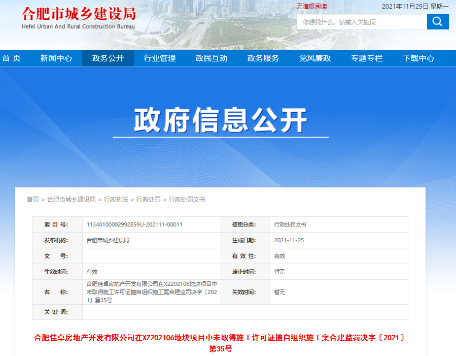 中国质量新闻网讯(顾爱龙)日前,合肥佳卓房地产开发有限公司因在XZ202106地块项目中未取得施工许可证擅自组织施工,违反了《安徽省建筑市场管理条例》第二十七条第四款的规定,合肥市城乡建设局对其罚款70.94万元。