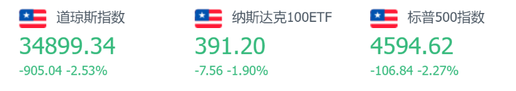 美股上周五大幅收跌,三大股指跌幅均超过2%,道指暴跌逾900点。道指跌905.04点,或2.53%,报34899.34点;纳指跌353.57点,或2.23%,报15491.66点;标普500指数跌106.84点,或2.27%,报4594.62点。