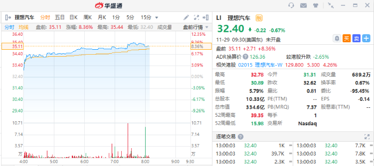 同板块个股蔚来汽车(NIO)、小鹏(XPEV)盘前走高,截至北京时间21:08,均涨2.5%。