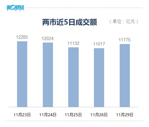 11月29日,A股低开后迅速走高,午后维持震荡。截至收盘,沪指跌0.04%,深证成指涨0.22%,创业板指涨1%。沪深两市成交额连续第27个交易日突破1万亿元。