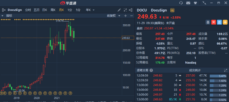 Docusign $DOCU 上周五逆市上涨了2.53%,其2020年的涨幅达到了约200%。