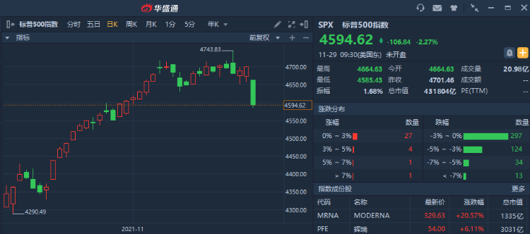 这次大跌的主要原因,可能就是南非出现的一种新冠变异株奥密克戎(Omicron)导致了市场恐慌。在还没有传出有关其破坏性的消息之前,欧洲政府就立即实施了旅行限制,此后大量投资者采取了避险措施,引发股市大跌。上周五标普500指数 $SPX 收跌2.27%。