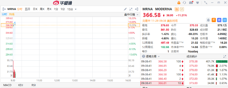 华盛资讯11月29日消息,美股盘初,美股抗疫概念股走高。Moderna(MRNA)一度涨超11%,截至发稿该股涨近10%;此前公司宣布针对变异毒株的疫苗可能在2022年初可供使用。