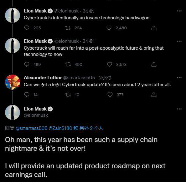 在回应推特用户关于 CyberTruck 更新的请求时,马斯克写道:“哦,伙计,今年真是供应链的噩梦,而且还没有结束!”他还补充说:“我将在下次财报电话会议上提供最新的产品路线图。”