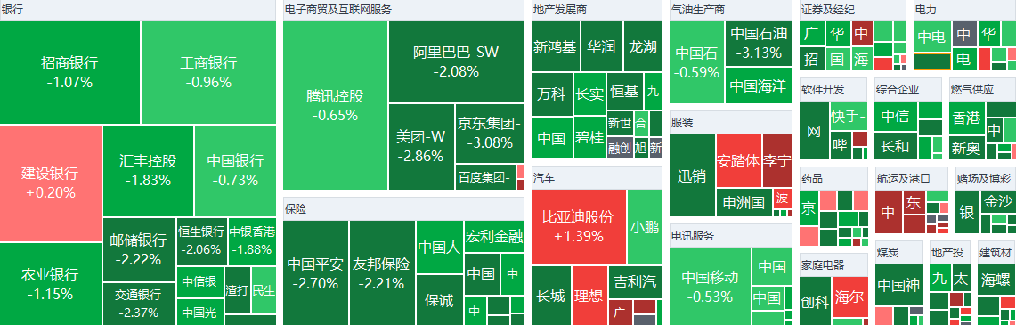 截止收盘,恒生指数跌1.58%,报收23475.26;恒生科技指数跌1.16%,报,6028.63;国企指数跌8368.49%,报收1.53;红筹指数跌2.14%,报收3740.98。