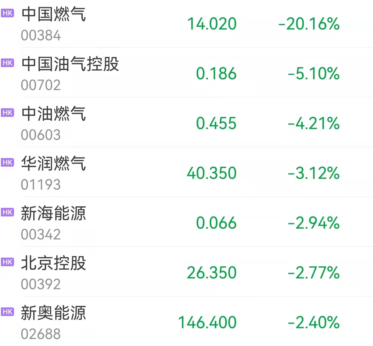周二燃气板块大幅下行,截止收盘,跌5.14%。其中中国燃气(00384)和中油燃气(00603)领跌,跌幅分别为20.16%和5.1%。