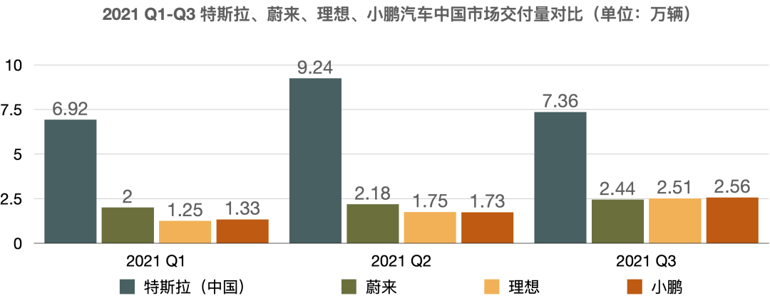 尽管蔚小理的交付量正在稳步攀升,但与特斯拉仍然存在不小的差距。今年前三季度,蔚来共交付了6.62万辆新车,小鹏、理想交付量分别为5.62万辆、5.51万辆。三家交付量之和仍敌不过特斯拉。
