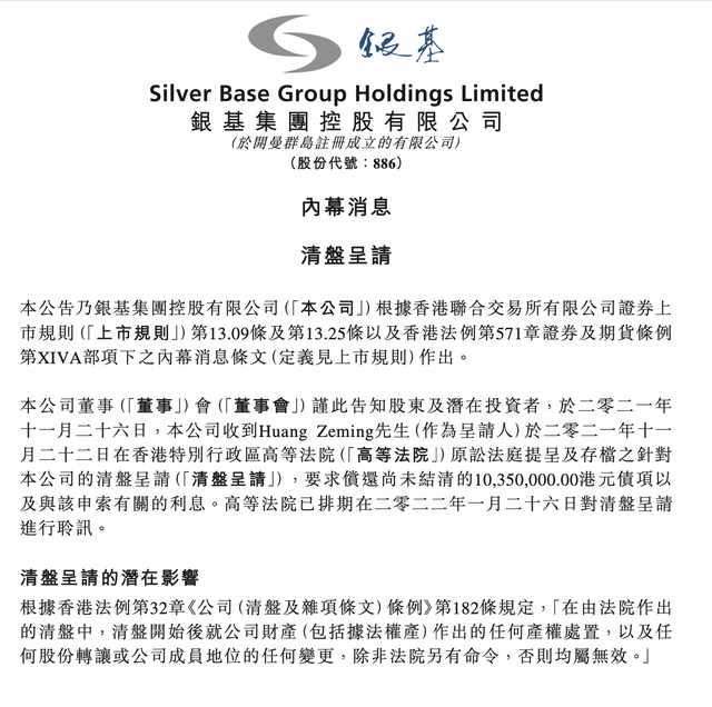 新京报讯(记者 薛晨)刚因亏损引发行业讨论的银基集团控股有限公司(以下简称“银基集团”),11月30日发布公告称,名为Huang Zeming的呈请人,于11月22日在香港特别行政区高等法院提呈针对银基集团的清盘呈请,要求偿还尚未结清的1035万港元债项以及相关利息。香港高等法院已排期在2022年1月26日对清盘呈请进行聆讯。