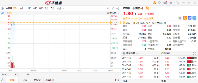 截至发稿,水滴公司一度涨超19%,现涨幅收窄至11%。今日美股盘前,水滴公布了截至2021年9月30日的第三季度未经审计的财务业绩。财报显示,水滴Q3营收7.79亿元(人民币),同比降低9.7%;净亏损为4.77亿元,去年同期净亏损为1.393亿元;摊薄后每股亏损为0.12元,去年同期每股亏损为0.19元。