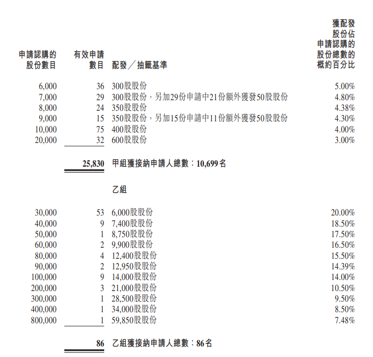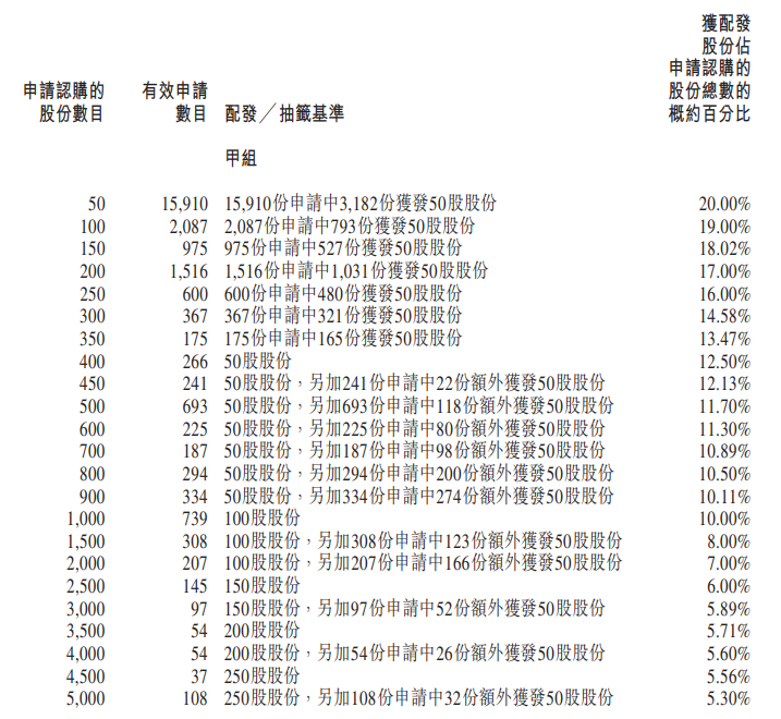 根据香港公开发售项下初步提呈发售的香港发售股份已获轻微超额认购。合共接获25916份有效申请,认购合共1427.405万股香港发售股份,相当于香港公开发售项下初步可供认购香港发售股份总数160万股约8.92倍。香港公开发售项下发售股份的最终数目为160万股,占全球发售项下初步可供认购发售股份总数约10%(任何超额配股权获行使前)。