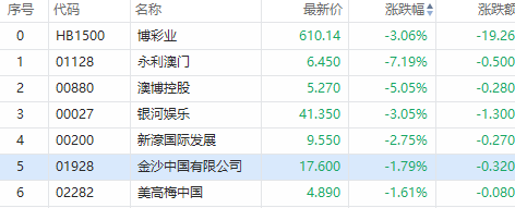 华盛资讯12月1日消息,博彩股继续受压下行,永利澳门(01128)跌7.19%,澳博控股(00880)跌5.05%,银河娱乐(00027)跌3.05%;新濠国际发展(00200)跌2.75%。