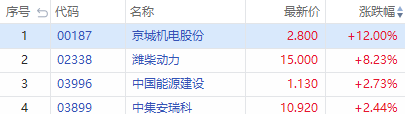 华盛资讯12月1日消息,港A两市氢能源概念股再度走高,截至发稿,京城机电股份(00187)涨12%,潍柴动力(02338)涨8.23%,中集安瑞科(03899)涨2.44%