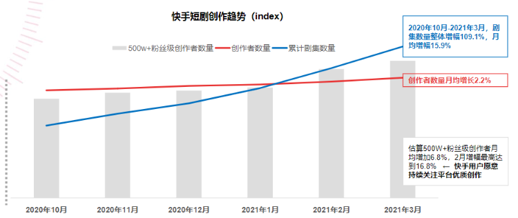 《快手短剧价值研究报告》指出,快手短剧是市场中最“老练”的短剧平台,具有“作者多、内容多、用户多”的特性。2020年10月到2021年3月,剧集数量整体增幅高达109.1%。