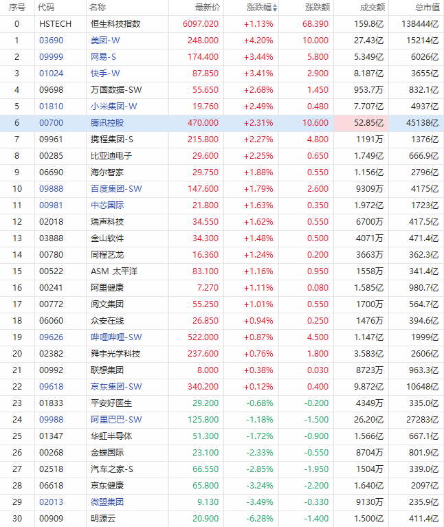 成分股方面,科网股普涨;美团涨4.2%,报248港元每股;网易、快手涨逾3%;比亚迪电子涨2.25%;腾讯、小米涨超2%;中芯国际涨1.63%。