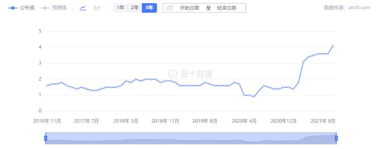 与此同时,作为通胀水平的重要衡量标的——美国员工薪酬水平在近期也持续上涨。10月,每小时工资年率已升至4.9%水平,市场预计11月将升至5.0%的高位。很显然,员工薪酬的上涨是因为就业市场形势和可用劳动力数量因疫情而变得不一致,这反而成了抬升通胀的助推力。