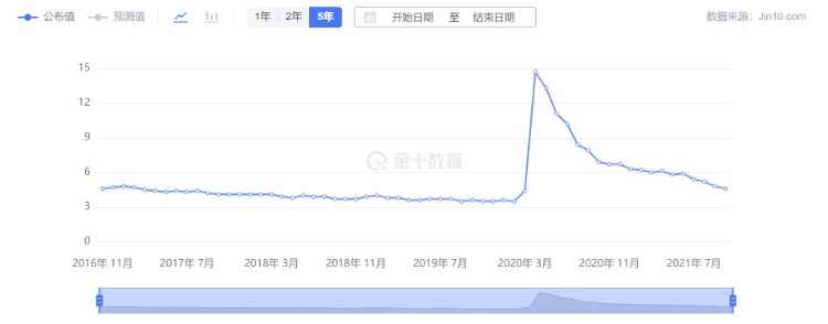 美联储长期以来的两大货币政策目标是稳定物价和充分就业,而且稳定物价一般放在首位。从美国劳工部公布的数据来看,美国10月失业率已降至4.6%,是去年3月疫情冲击以来新低,快要接近此前5年的平均水平。
