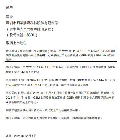 12月1日消息,明华科技(08301.HK)公告,香港联合交易所有限公司(联交所)宣布,由2021年12月6日上午9时起,深圳市明华澳汉科技股份有限公司(该公司)的H股的上市地位将根据《GEM规则》第9.14A条予以取消。