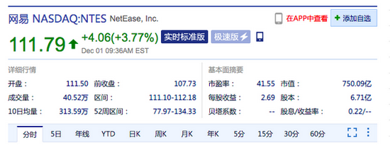新浪科技讯 12月1日晚间消息,网易美股涨超3%,报111.8美元每股,市值约750亿美元。旗下云音乐明日在港交所挂牌交易。