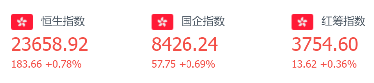 周二港股高开高走,午后涨幅缩窄。截至收盘,恒生指数涨183.66点或0.78%,报23658.92点;国企指数涨0.69%,报8426.24点;恒生科技指数涨0.50%,报6058.80点。