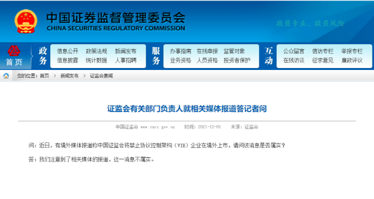 近日,有境外媒体报道称中国证监会将禁止协议控制架构(VIE)企业在境外上市。证监会有关部门负责人表示,我们注意到了相关媒体的报道,这一消息不属实。