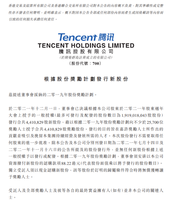 突发!腾讯 $00700.HK 出手:向2.57万人发股票 人均超8万港元!