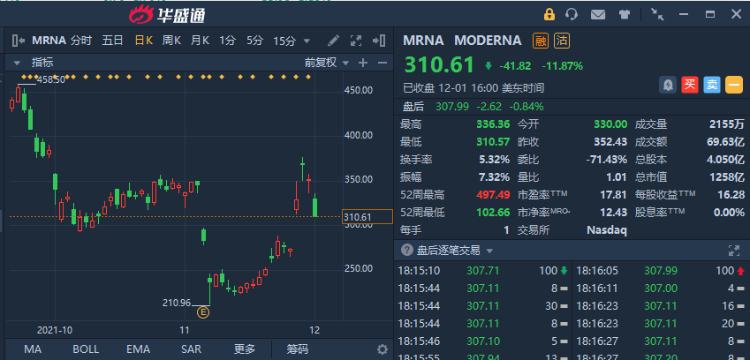 疫苗制造商Moderna股价周三收盘重挫11.87%,报310.61美元,此前报道称在美国发现的首例奥密克戎(omicron)变异毒株感染者此前已接种两针莫德纳新冠疫苗。