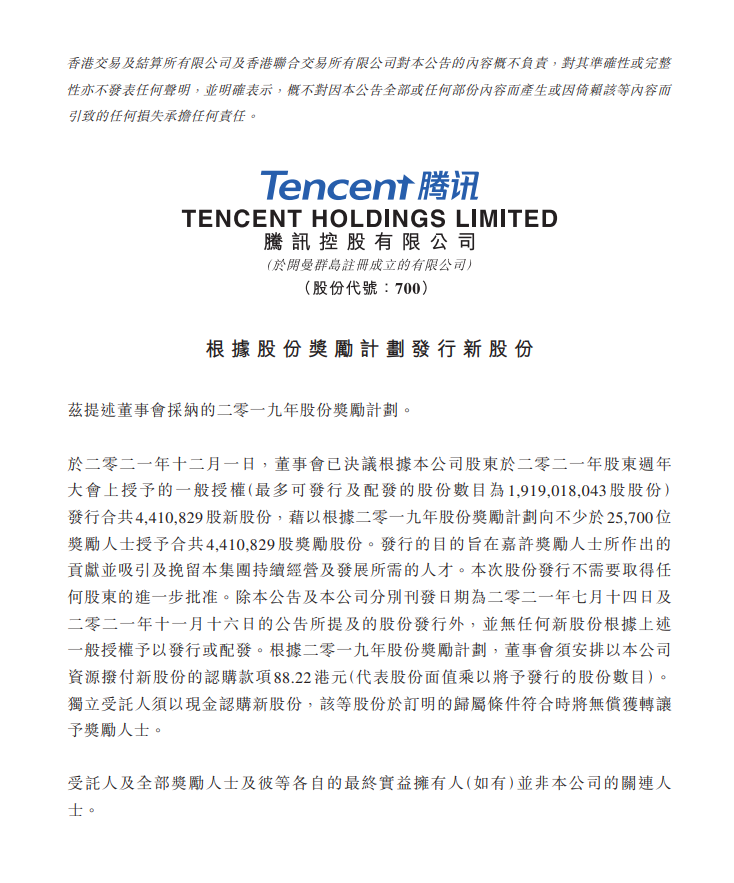 消息面上,截至12月1日港股收盘,腾讯的股价为468.8港元/股,据此计算,此次奖励股票的总价值约为20.67亿港元。按照25700位奖励人士计算,人均可获得超8万港元。