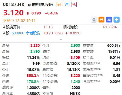 华盛资讯12月2日消息,港股氢能源概念股再度走高,京城机电股份涨超6%,潍柴动力涨超5%,中集安瑞科涨3%。