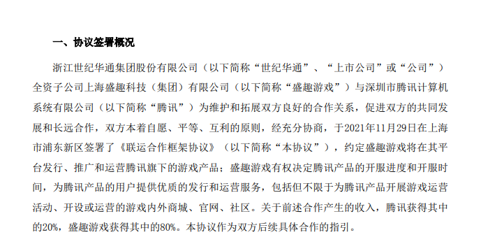 公告表示,全资子公司盛趣游戏与腾讯签署了《联运合作框架协议》约定盛趣游戏将在其平台发行、推广和运营腾讯旗下的游戏产品;盛趣游戏有权决定腾讯产品的开服进度和开服时间,为腾讯产品的用户提供优质的发行和运营服务,包括但不限于为腾讯产品开展游戏运营活动、开设或运营的游戏内外商城、官网、社区。
