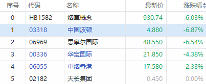 华盛资讯12月3日消息,港股烟草概念股跌幅扩大,中国波顿跌超6%,思摩尔国际跌超6%,华宝国际跌超4%,中烟香港跌超2%。