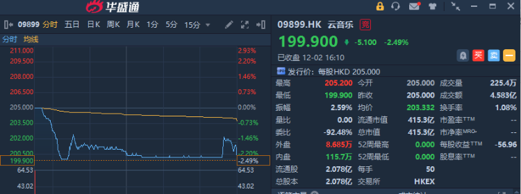 华盛资讯12月2日讯,在线音乐平台云音乐 $09899.HK 首挂平开,盘中小幅走低,尾盘收跌2.49%,一手账面浮亏250港元,全日成交额4.58亿港元,最新总市值超415亿港元。