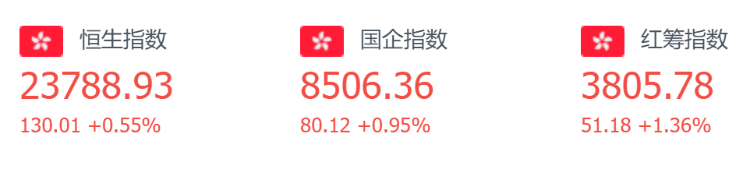 周四港股低开高走,午后涨幅缩窄。截至收盘,恒生指数涨130.01点或0.55%,报23788.93点,全日成交额达1475.63亿港元。国企指数涨0.95%,报8506.36点;恒生科技指数跌0.68%,报6017.56点。