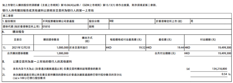 小米集团 $01810.HK 耗资约1950万港元回购100万股