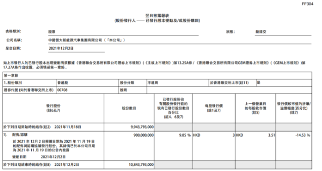 12月2日消息,公告称,2021年12月2日根据配售与认购协议以每股3港元的价格发行9亿股股份,占发行前的现有已发行股份数目的9.05%。