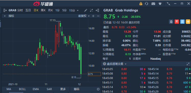 东南亚最大的叫车服务和快递公司Grab周四正式在纳斯达克交易,代码“GRAB”,此前该公司与“特殊目的收购公司”(SPAC)达成近400亿美元的合并交易。Grab上市当日震荡激烈。开盘报13.06美元,较Altimeter周三收盘价11.01美元上涨18.62%。不过此后Grab盘中“破发”,且大体呈一路下行态势,Grab最终收盘大跌21%,收于8.75美元。