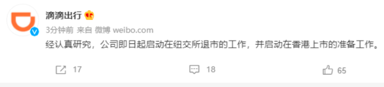 滴滴出行:经认真研究,公司即日起启动在纽交所退市的工作,并启动在香港上市的准备工作。