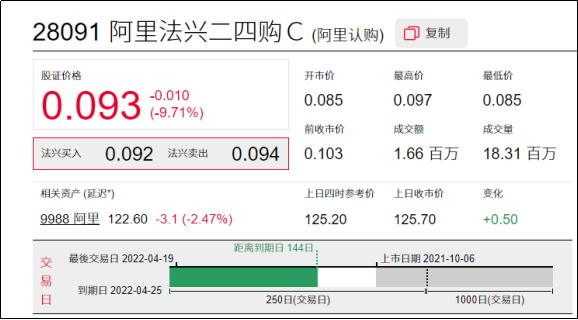 2、看错方向:阿里法兴二四购C(28091.HK),周四下跌9.71%。