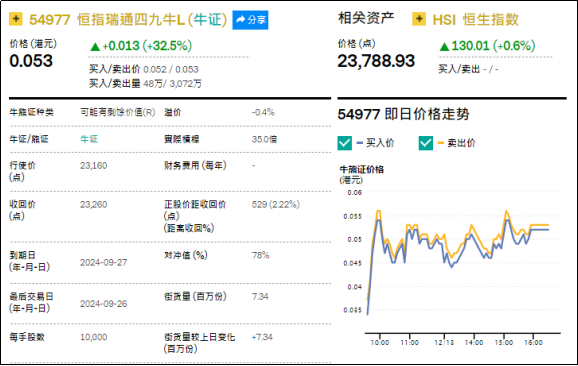 1、强势轮证:恒指瑞通四九牛L(54977.HK),周四上涨32.5%;