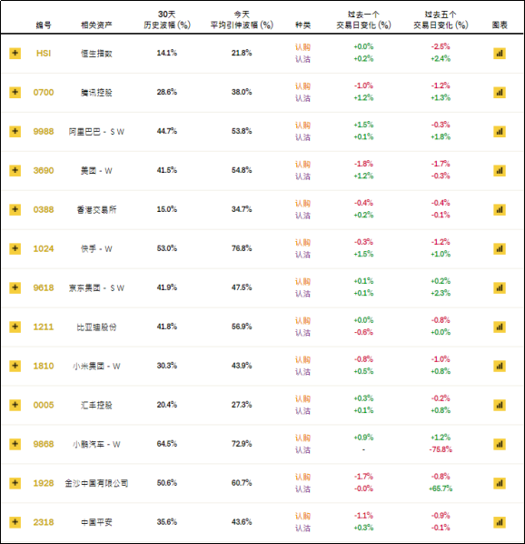 周四恒指相关权证的平均引伸波幅报约21.8%。个股方面,美团、金沙相关认购证的引伸波幅按日调降显著;快手、腾讯相关认沽证的引伸波幅则按日调增。