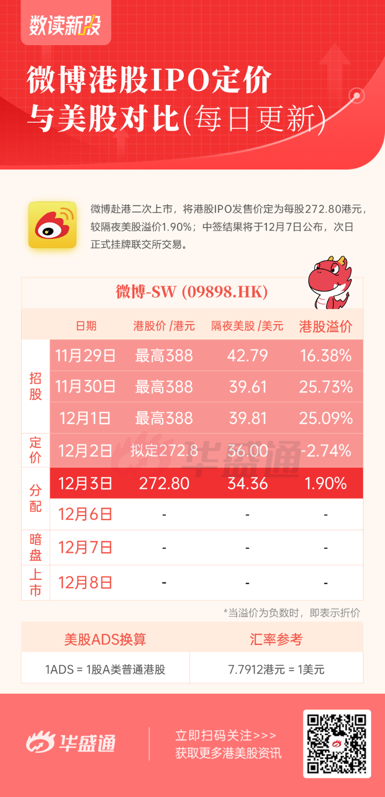 微博赴港二次上市,宣布将港股IPO发售价定为272.8港元/股,较隔夜美股溢价1.90%;中签结果将于12月7日公布,次日挂牌联交所交易。