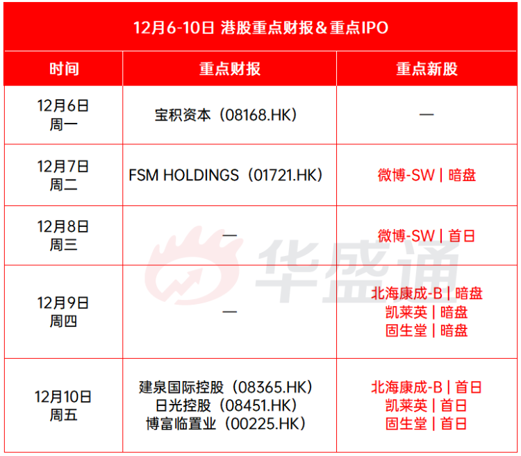 新股方面,微博-SW $09898.HK 12月8日(周三)上市;北海康成-B $01228.HK 、凯莱英 $06821.HK 、固生堂 $02273.HK 12月10日(周五)上市 ;财报方面,港股暂无重点公司将发布财报。