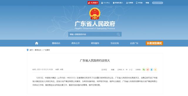 据广东省人民政府网站消息,12月3日,中国恒大集团(在香港联交所发布了无法履行担保责任的公告,广东省人民政府对此高度关注,当晚立即约谈了中国恒大集团实控人许家印先生。应恒大地产集团有限公司请求,为有效化解风险,保护各方利益,维护社会稳定,广东省人民政府同意向恒大地产集团有限公司派出工作组,督促推进企业风险处置工作,督促切实加强内控管理,维护正常经营。