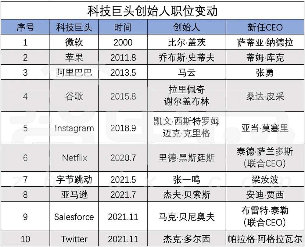 创始人对于一家公司而言意义重大,尤其是成功的企业。现在一些大型科技公司的创始人逐渐退至幕后,例如微软和阿里巴巴的创始人比尔·盖茨、马云,他们选择退休专心慈善事业;苹果、谷歌、Instagram、字节跳动、亚马逊、Twitter也都选择任命新的CEO;或者像Salesforce、Neflix的创始人一样,选择分摊权力给副手。