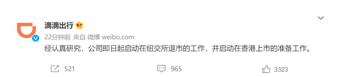 6、上市5个月后,滴滴宣布将在纽交所退市,并启动赴港上市