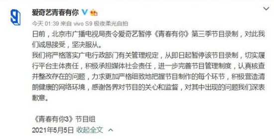 今年5月,爱奇艺选秀节目《青春有你》出现“倒奶事件”,被北京市广播电视局责令暂停后续节目录制。此后,赞助商蒙牛发布致歉声明,紧接着爱奇艺也公布了整改措施,停止录制和直播原定5月8日的成团之夜。