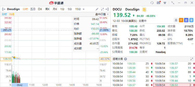 华盛资讯12月3日消息,美股盘初,电子签名公司DocuSign低开低走,截至发稿,该股跌幅扩大至40.33%,股价报139.52美元。