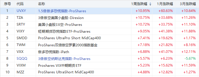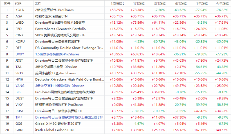 美股指数ETF方面,做多恐慌指数ETF $UVXY 和 3倍做空美国小盘股ETF $TZA 一周皆累涨近11%;2倍做空罗素2000指数基金 $TWM 涨超7%,3倍做空纳斯达克指数ETF $SQQQ 涨近6%。