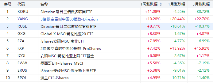 区域ETF方面,本周涨幅居首位的是3倍做多韩国ETF $KORU ,一周累计上涨11.08%;其次是3倍做空富时中国50指数ETF $YANG ,一周累涨10.28%。