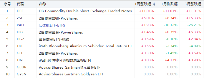 从商品ETF涨幅榜来看,2倍做空白银ETF $ZSL 涨幅居首,一周累涨超5%;2倍做空黄金ETF $DZZ 涨1.46%。