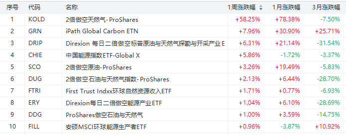 能源方面,得益于美国天然气期货价格连续大跌,2倍做空天然气ETF $KOLD 本周暴涨超58%。